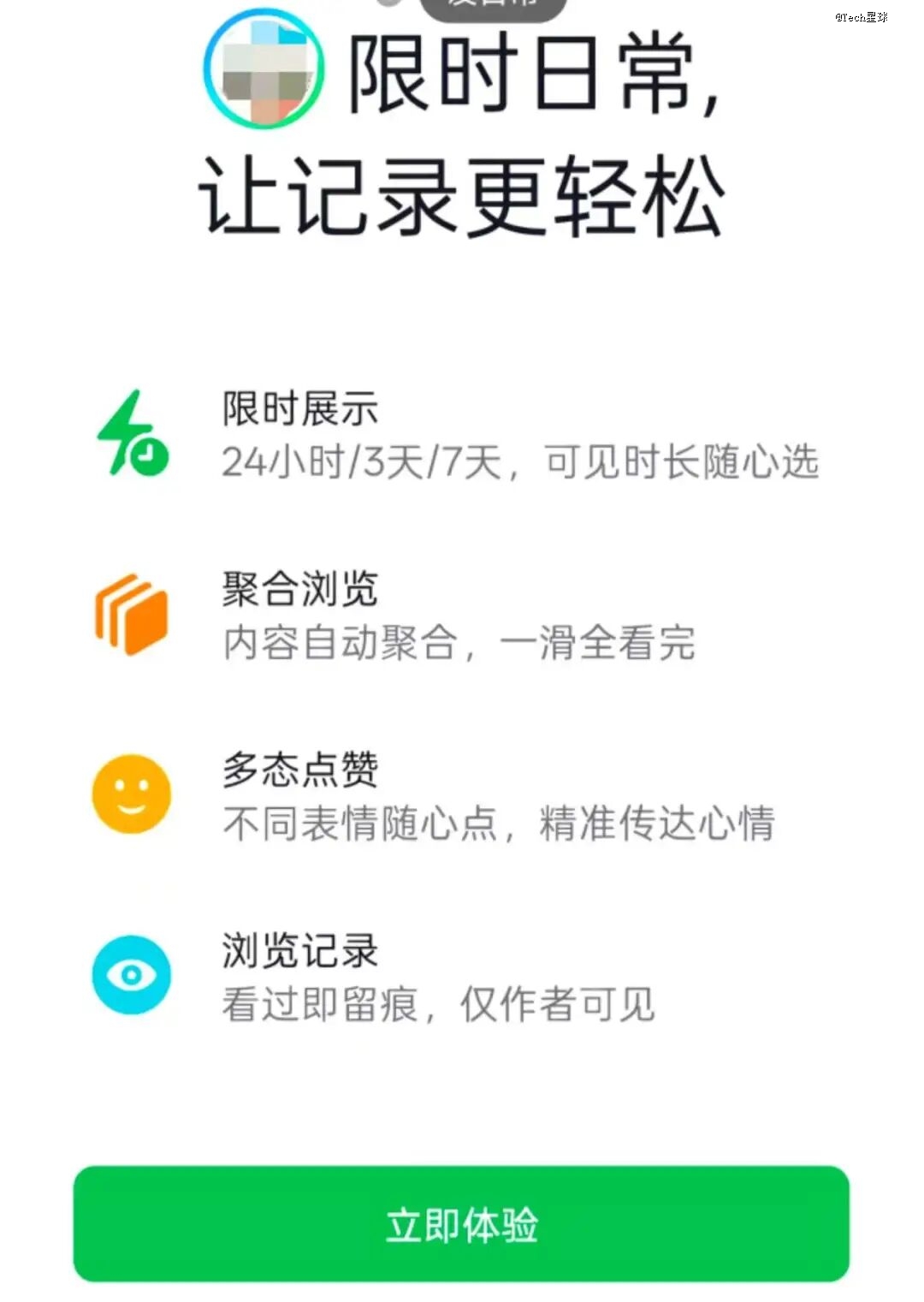 新的创作入口更加醒目,位于个人主页的头像右下方的“+”号,点击后可以发布日常图文或视频内容,且可以设置24小时/3天/7天的限时展示。头像色环,即好友在发布动态后,会在头像周围形成蓝色、绿色或紫色等不同颜色的色环,表示当前他们有新的消息动态,当自己观看该动态后,好友头像的色环会消失并恢复正常。