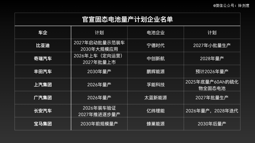 迈入2025年之后,比亚迪、上汽集团、长安汽车等主流汽车厂商纷纷发布固态电池的上车时间表,大多集中在2026年至2027年。