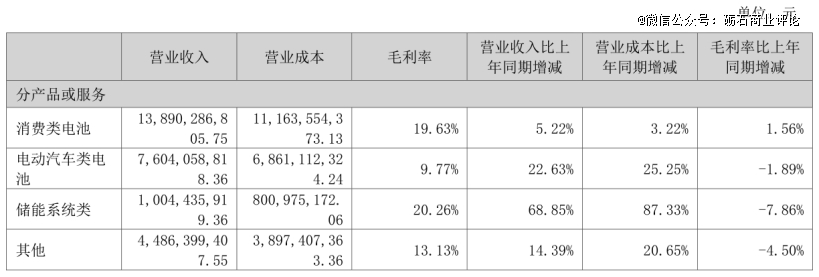 分产品来看,欣旺达消费类电池实现营收138.90亿元,同比增长5.22%,毛利率为19.63%,同比增长1.56个百分点;电动汽车类电池实现营收76.04亿元,同比增长22.63%,毛利率为9.77%,同比下降1.89个百分点;储能系统类实现营收10.04亿元,同比增长68.85%,毛利率为20.26%,同比下降7.86个百分点。