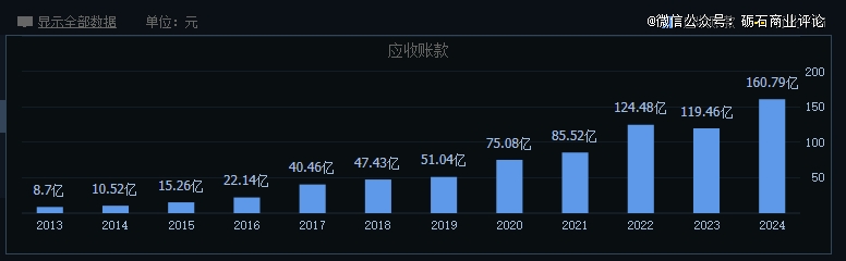 除了毛利率水平不及竞争对手之外,欣旺达的回款能力也不容乐观。数据显示,2019年-2024年,欣旺达应收账款余额由51.04亿元大幅攀升至160.79亿元,应收账款增速远高于同期营业收入增速,这说明公司对于赊销模式愈发依赖。