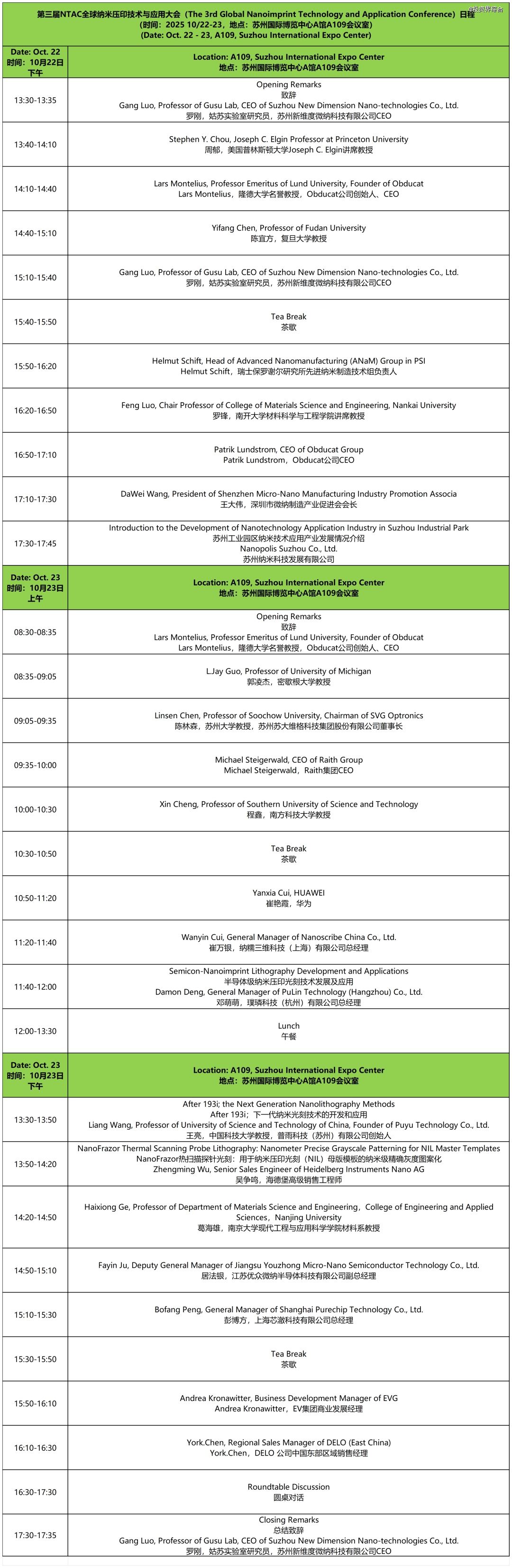 纳米压印技术自1995年发明以来,至今已走过辉煌的 30 年历程,本届大会以“三十载技术革新·智启纳米压印新未来”为主题,汇聚了包括“纳米压印技术之父”、美国普林斯顿大学周郁教授,瑞典隆德大学Lars Montelius教授,以及Raith公司CEO、华为技术专家等在内的20余位来自美国、瑞典、德国、中国等专业领域的顶 尖学者与产业领 袖,将共同为突破纳米压印技术制造领域发展瓶颈出谋划策,全力推动国内制造业技术革新与产业腾飞,在纳米压印技术30年发展的新征程上,续写更加辉煌的篇章。