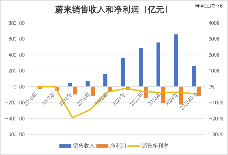 自2016年至2025年上半年,蔚来已经连续多年亏损,累计净亏损超过1000亿元。其中2021年至2024年净亏损逐年上升,到2024年达到224.02亿的亏损高位。