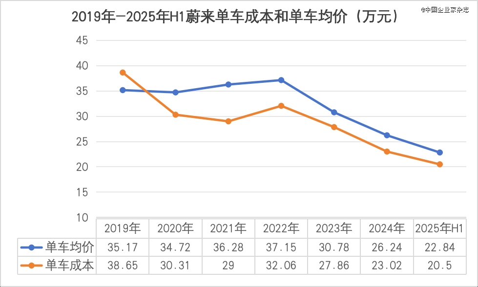 2021~2022年,全球锂、钴、镍等原材料价格暴涨,碳酸锂价格从2020年的4.56万元/吨飙升至2022年的48.21万元/吨,直接推高电池包成本,导致蔚来单车成本从2020年的30.31万元上升至2022年的32.06万元,上升约1.75万元。2023年以后,碳酸锂价格虽一路暴跌,但蔚来单车成本的下降幅度不及单车均价的降幅。2022年至2025年H1,蔚来单车成本下降约11.56万元,单车均价下降约14.31万元。