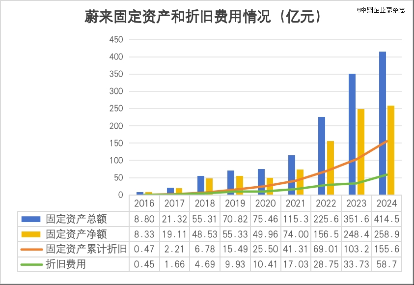 根据年报披露,蔚来固定资产总额逐年攀升,折旧费用也水涨船高,从2019年的9.93亿元攀升至2024年的58.7亿元,累计增幅高达491.14%,2019~2024年间累计折旧费用超过158亿元,占销售收入的7.6%。重资产投入产生的长期折旧费用,将持续影响利润,且折旧费用属于固定成本,如果未来蔚来销量发生波动,折旧费用将进一步侵蚀利润。