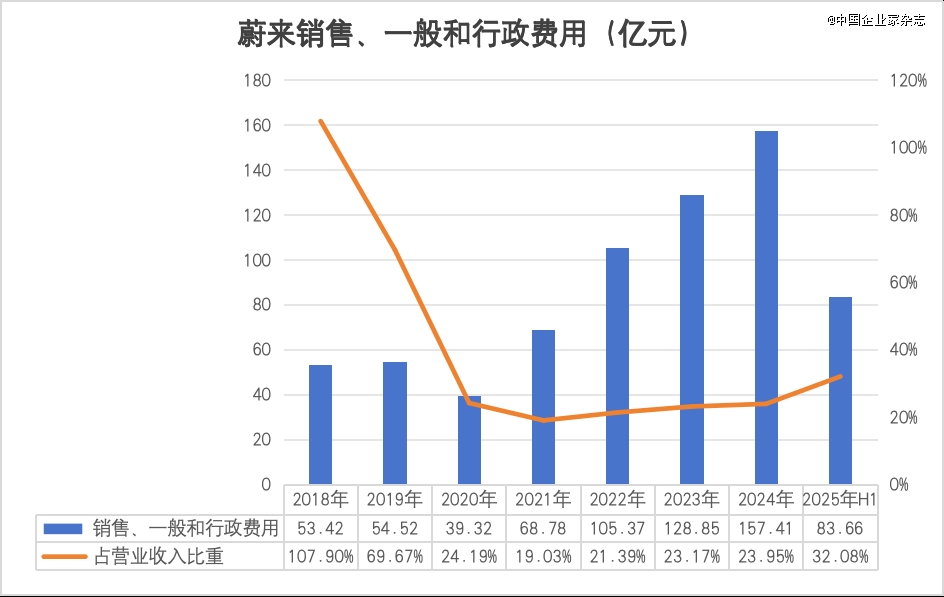 财报显示,蔚来的销售和行政费用在2018年至2024年间持续上涨,从53.42亿元攀升至157.41亿元,累计增幅高达194.66%,呈现刚性快速增长的特征。