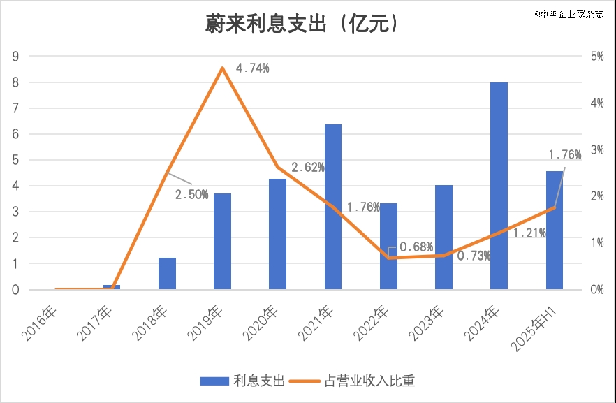 从2016年到2025年Q2,蔚来利息支出经历了两个阶段的攀升。