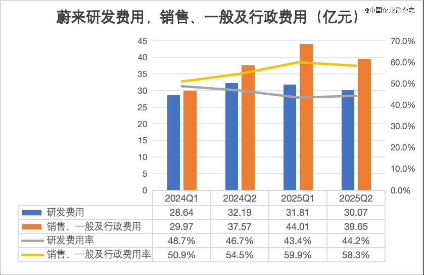 蔚来管理层在财报中着重强调了“结构性拐点”的来临。数据表明,扣除特殊费用后(股权激励及组织优化),二季度研发费用环比下降14.6%,降至24.89亿元;销售、一般及行政费用环比下降12.6%,降至36.8亿元。这种成本优化主要源于三个方面:人员结构的合理调整、营销费用的精简以及组织流程的再造。