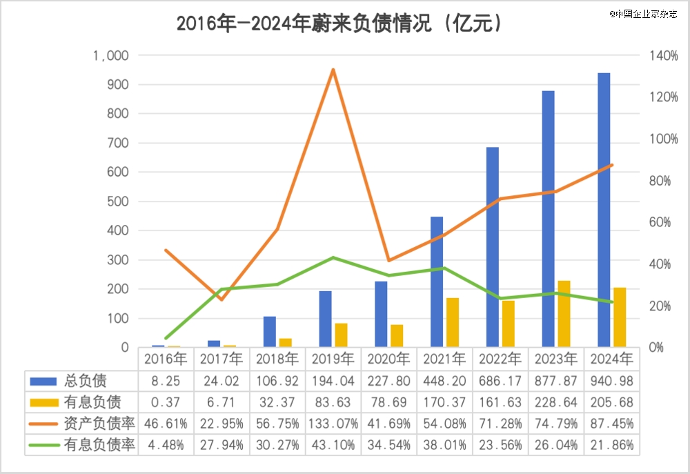 财报显示,蔚来的资产负债率从2020年的41.69%翻倍至2025年Q2的93.39%,突破行业偿债风险阈值。同时,有息负债几乎都保持在20%以上,给企业带来较大的还本付息压力。