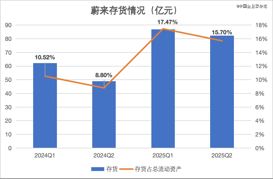 财报显示,蔚来今年上半年存货169.39亿元,同比大幅增长52.7%,其中二季度存货82.43亿元,同比增长68.7%。