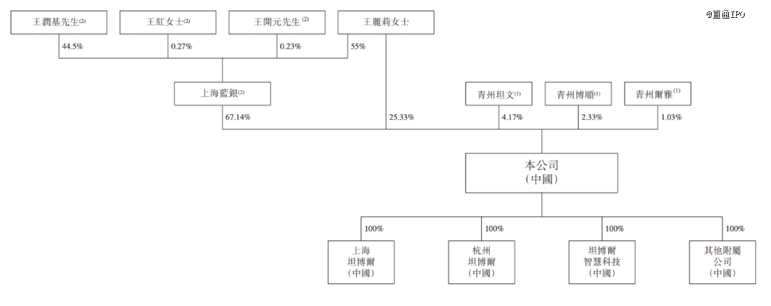 2022年12月,创始人王勇萍辞任公司董事,其妻王丽莉成为坦博尔新的掌舵人。招股书显示,坦博尔在香港上市前的股东架构中,王丽莉女士直接及间接合计持股约96.64%,为公司的控股股东;其他股东包括雇员激励平台青州博顺、青州尔雅,分别持股2.33%,1.03%。