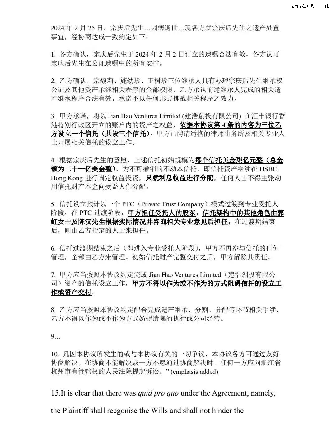 舆论质疑和诉讼压力下,宗馥莉不仅未采取任何安抚和谈判,反而试图通过上层监督施压,尽快确认回购协议效力,从而将关键股权纳入自身控制范围。