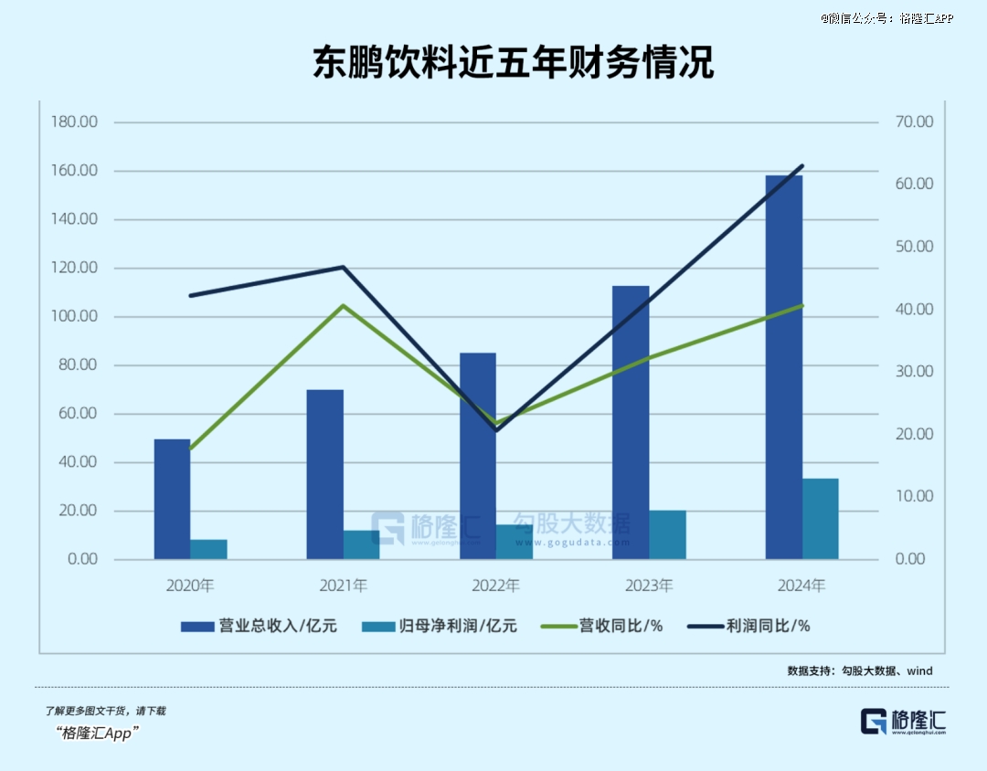 近年来,东鹏饮料的业绩持续增长。2021年到2024年间,东鹏饮料营业收入从69.78亿元增长至158.39亿元,直接翻倍。