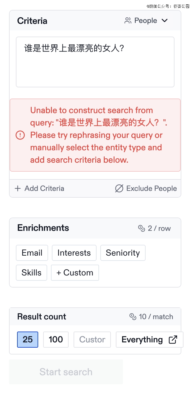 Websets 的应对方式则不同。由于它被设计为处理结构化查询,面对这样一个开放式问题,它会试图将其转化为一个可执行的、基于数据的检索任务。