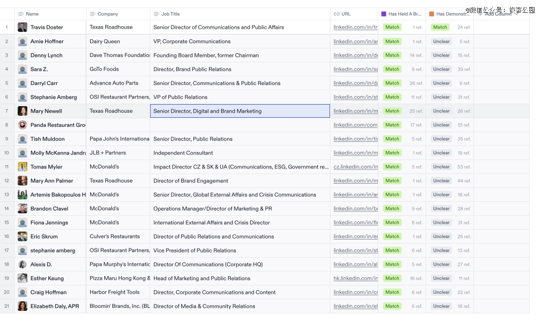 对于条件一,系统准确地从公开信息中找到了在德州公路扒房(Texas Roadhouse)、麦当劳(McDonald's)、棒约翰(Papa John's)等大型餐饮连锁集团中,担任「高级公关总监」、「企业传播副总裁」等符合条件的高管。这部分任务,它完成得相当精确。