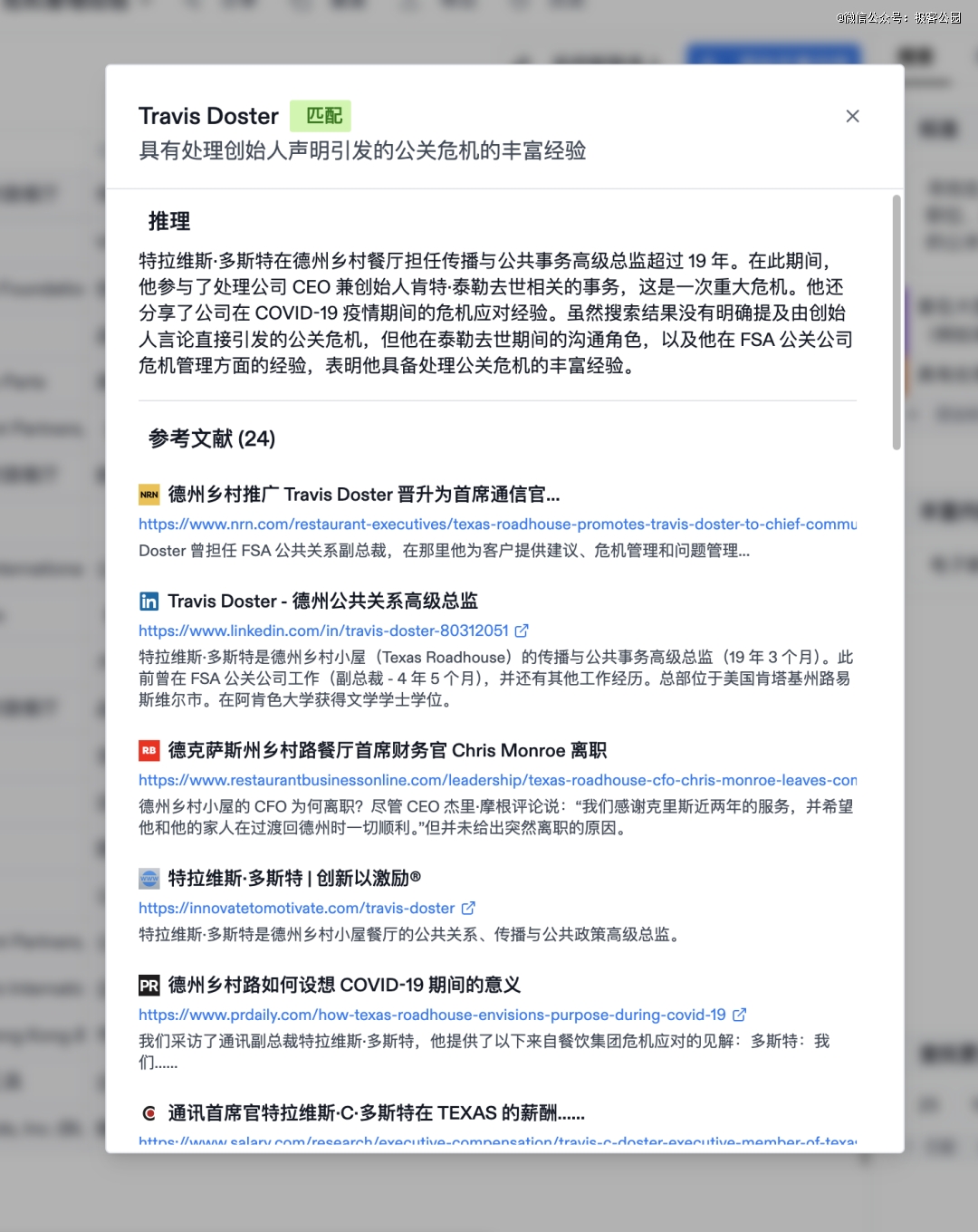 条件二就颇有一些难度,因为「处理创始人个人言论引发的公关危机经验」是一个相对难验证的事情。系统并没有给出简单的「是」或「否」。相反,它在右侧生成了额外的验证列,并给出了「Match」(匹配)或「Unclear」(不明确)的标注。