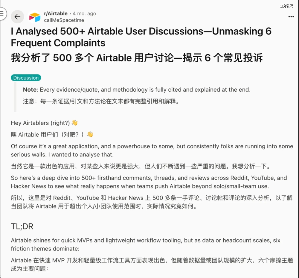 Reddit社区上,有大量用户总结Airtable的缺点
