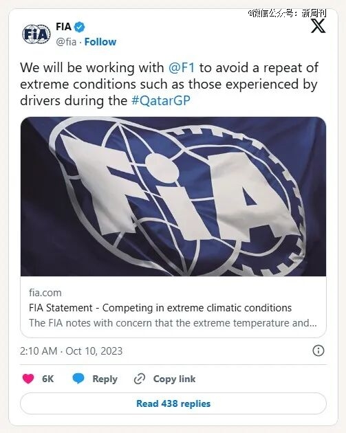 FIA官方发布动态,宣布将与 F1 携手,防止车手遭遇的极端环境状况重演。(图/社交媒体截图)