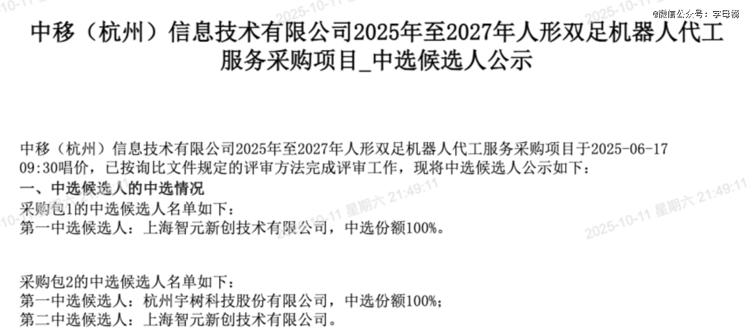 今年6月,中移(杭州)信息技术有限公司发布采购公告,采购包1是全尺寸人形机器人,采购包2为小尺寸人形机器人。在中选候选人公示阶段,智元拿下了采购包1,价值7800万元;而采购包2的中选候选人分别是宇树和智元,最终是宇树100%份额中选,价值4605万元。