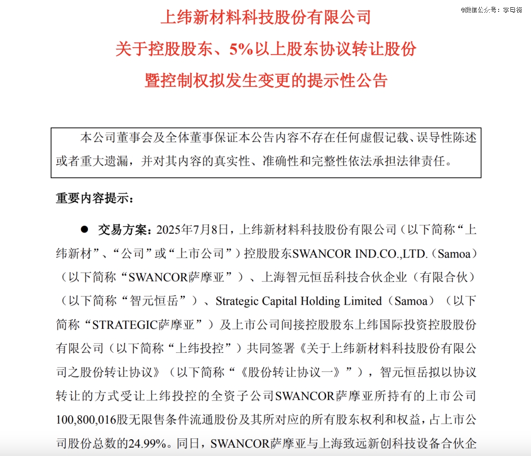 7月9日,科创板上市公司上纬新材发布公告称,智元机器人拟收购其至少63.62%、至多66.99%的股份。交易完成后,智元恒岳将成为控股股东,智元创始人邓泰华将成为上纬新材的实际控制人。