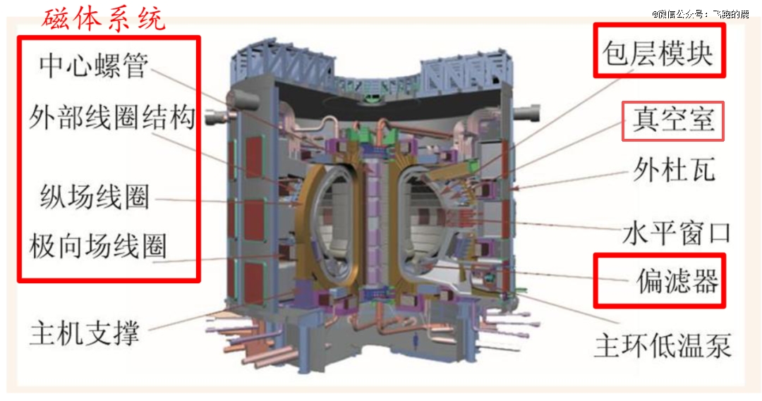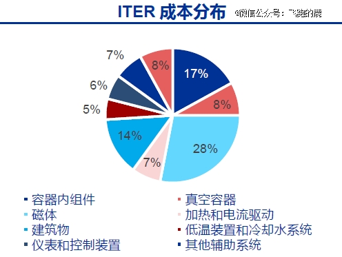 托卡马克是当前传统主流设备,它像个 “环形磁笼子”—— 用特殊的环形磁性结构把等离子体和容器壁隔离开,专门为核聚变反应创造封闭空间。拿最完整的 ITER 举例,托卡马克的主要部件包括磁体系统、真空室、包层模块、偏滤器、真空杜瓦,还得靠真空系统、低温系统、氚增值系统、电源诊断系统等支持系统才能运转。其成本构成如下: