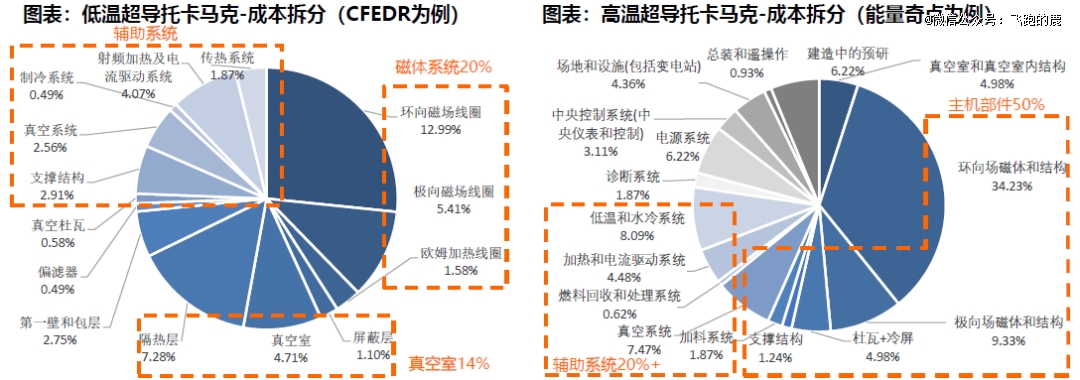 在托卡马克的成本里,磁体系统占比最高,它主要由铌锡和铌钛超导线圈构成,用来实现磁场控制;其中低温超导托卡马克的磁体系统占比约 28%,高温超导托卡马克的磁体系统占比更高,约为 50%。