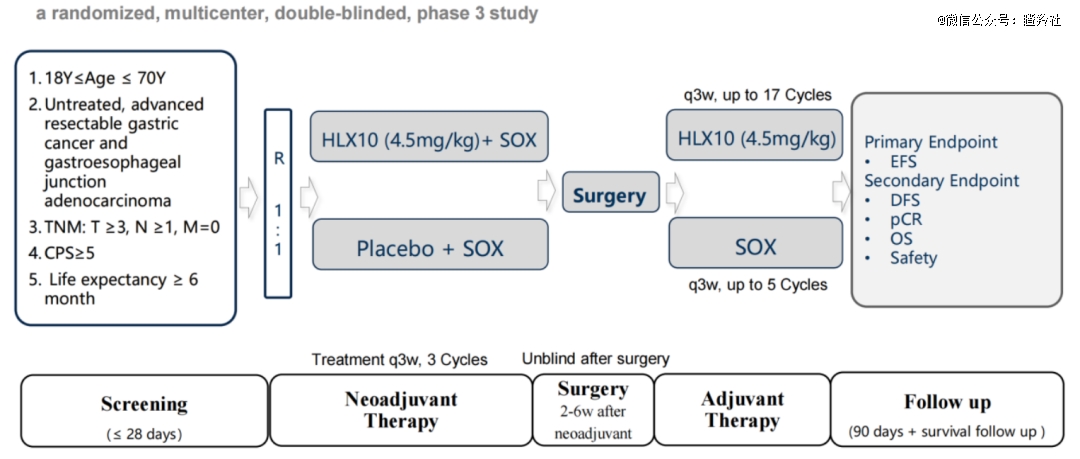 研究入组患者1:1随机分为两组:试验组先接受3个周期H药(4.5 mg/kg)联合SOX方案治疗;对照组接受安慰剂联合SOX方案治疗。新辅助治疗结束后2-6周内进行手术切除。术后辅助治疗阶段,试验组继续接受最多17个周期H药单药治疗;对照组接受最多5个周期的SOX方案辅助治疗。