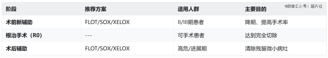 当前,国内外胃癌围手术期治疗仍以化疗为基石,术前给予2-4周期的新辅助化疗,采用FLOT(氟尿嘧啶、亚叶酸、奥沙利铂、多西他赛)、SOX(奥沙利铂+S-1)或XELOX(卡培他滨+奥沙利铂)其中一种化疗方案,进行根治手术后仍需进行4–6周期(或最长1年)的化疗,同样是FLOT/SOX/XELOX其中一种化疗方案。然而,在不同地区和人群中的疗效存在差异。