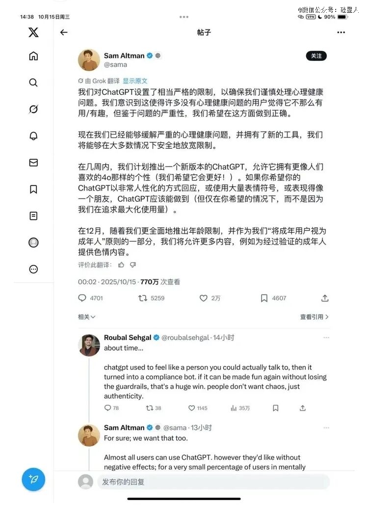 特别是在昨日,Sam Altman在X上再次回应了争议,称将推出成人模式,进行区分。