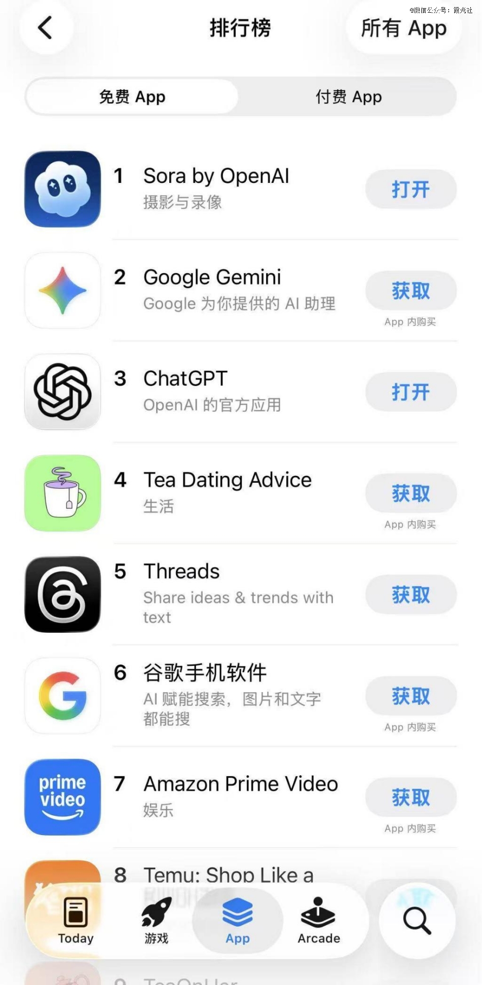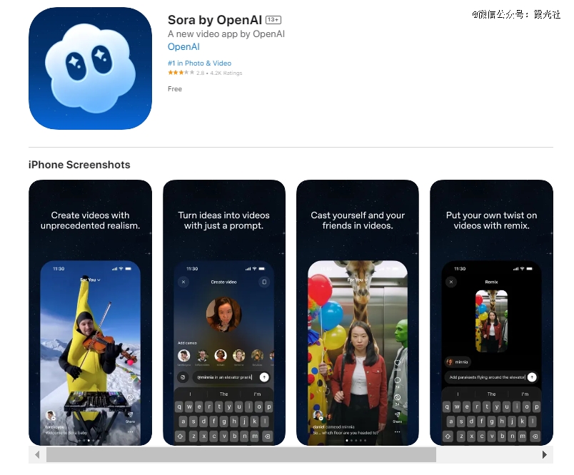 Sora App上线第四天,就拿下了苹果美国应用商店App Store的免费应用榜*名,超越了Gemini和ChatGPT,堪称“出道即顶流”。