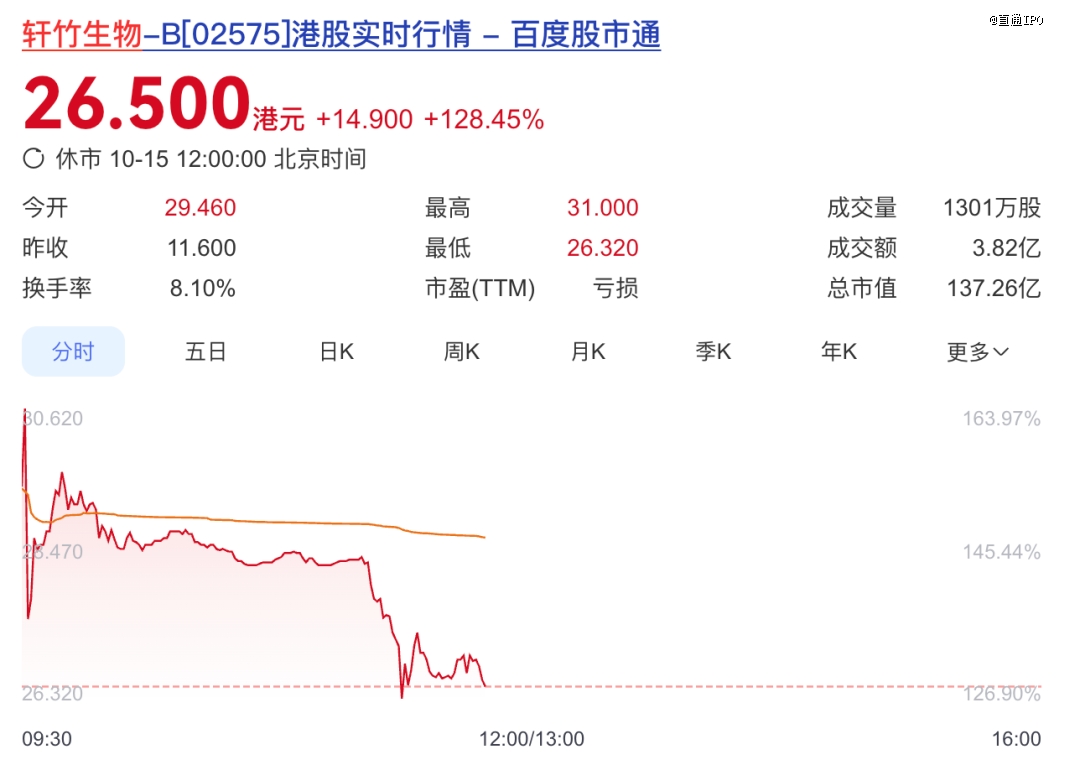 2025年10月15日,轩竹生物科技股份有限公司(简称:“轩竹生物”)在港交所上市。每股发售价11.6港元,开盘涨153.97%至29.46港元;截至午间休盘,每股涨128.45%至26.5港元,总市值137.26亿。