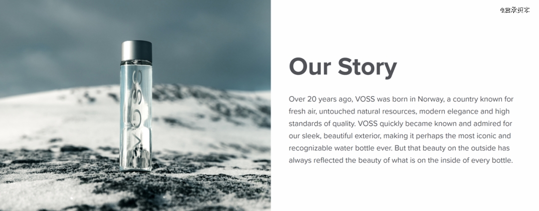 VOSS的颠覆性在于,它不像其他高端水标榜自己拥有悠久历史或稀缺水源(例如,法国依云—阿尔卑斯山水源水源地),VOSS的故事基于“创造”——创造一种“水可以成为奢华与优雅的象征”的理想,并围绕它构建*的“Be”层价值。