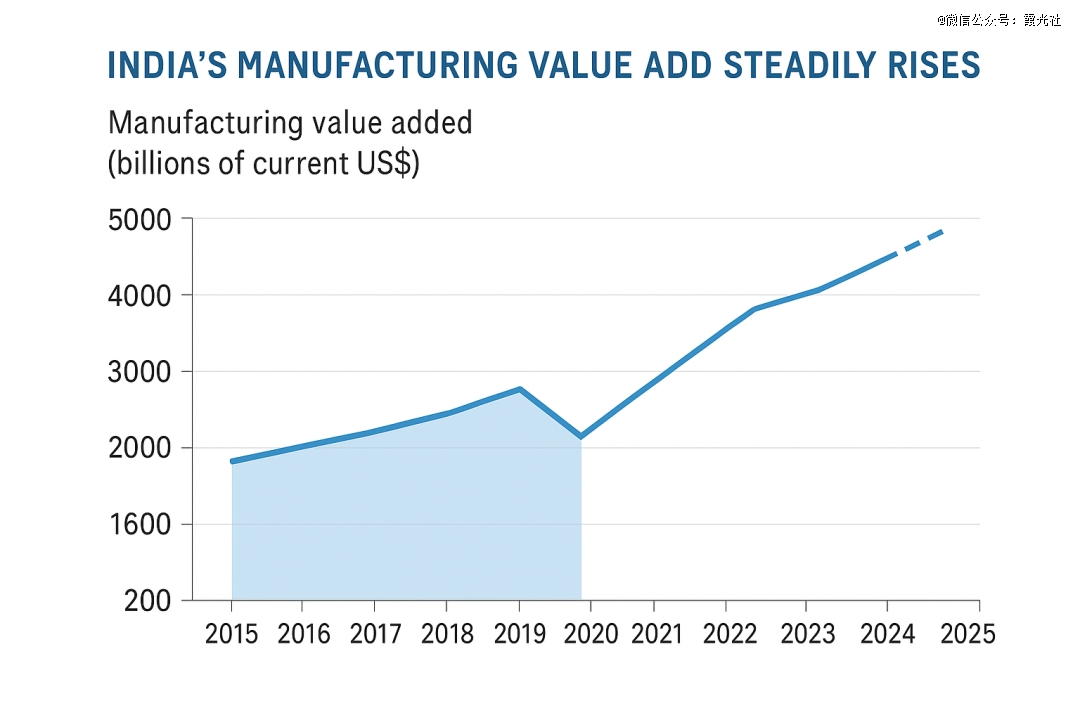 印度的经济仍以服务业与消费为主,制造业的增长虽快,却未能撬动整体结构性转型。数据上看,纵观数据,印度制造业的产出在增长、投资在扩大、出口在上升,但“制造业占GDP比重”这一指标,却在过去十年始终徘徊在15%至16%之间。