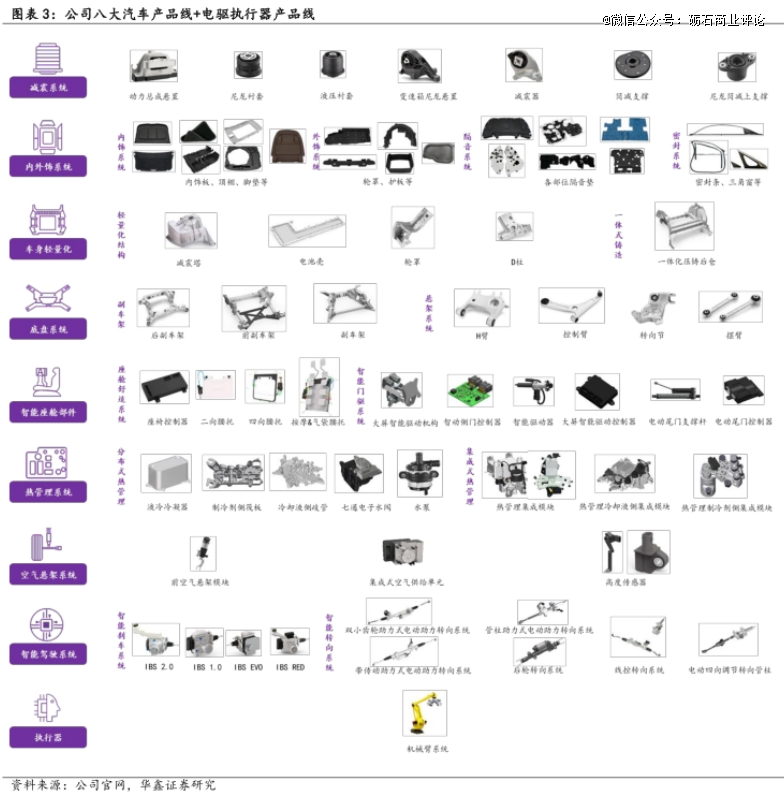 上市之后,拓普集团精准地抓住了国内汽车产业电动化转型的风口,并将公司产品线从减震、内饰延伸到轻量化底盘、热管理、智能驾驶等领域,合作客户包括特斯拉、华为-赛力斯、小米、吉利、比亚迪、奇瑞、理想、蔚来、长城、小鹏等知名车企。截至目前,拓普集团主营业务已经涵盖NVH减震、内外饰、热管理、底盘系统等八大系列产品,属于国内汽车零部件领域品类最丰富的企业之一。
