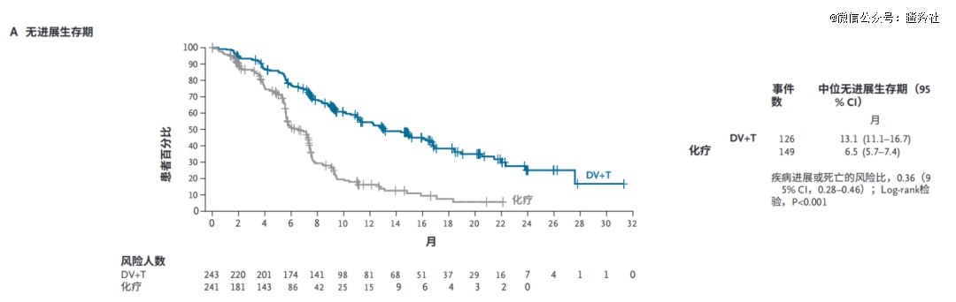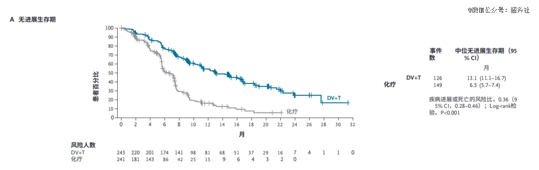 在PFS层面,维迪西妥单抗+特瑞普利单抗治疗组画出了一条非常漂亮的曲线,mPFS达到13.1个月,显著优于对照组的6.5个月,mPFS相比含化疗实现了翻倍,0.36的HR也展出这一项数据的统计学显著性;