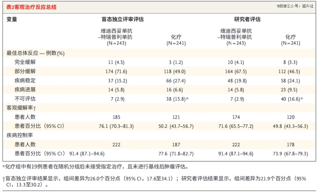 不仅在研究主要双终点中表现出色,维迪西妥单抗+特瑞普利单抗组合的ORR、DCR也同样过硬。治疗组76.1%的ORR远超对照组的50.2%,治疗组DCR则是高达91.4%,远超对照组的77.6%。