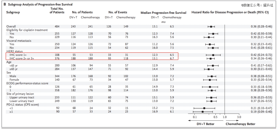 值得注意的是,在所有预设亚组中,mPFS、mOS获益普遍一致,无论患者内脏转移状态如何、是否使用顺铂、PD-L1的表达水平高低、HER2表达水平高低等,这代表维迪西妥单抗+特瑞普利单抗这一组合巨大的疗效与市场潜力,未来有望写入指南作为一线治疗UC全人群推荐。