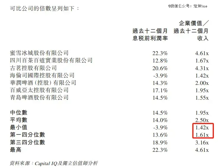 具体而言,估值师选出了7家可比的上市公司,包括:蜜雪冰城、茶百道、古茗、海伦司、华润啤酒、百威亚太、青岛啤酒。这些公司都满足两个标准:主要运营地在中国,并且是收入50%以上来自中国的香港上市公司;主营业务为提供现制饮品或生产、销售及分销啤酒产品的企业。