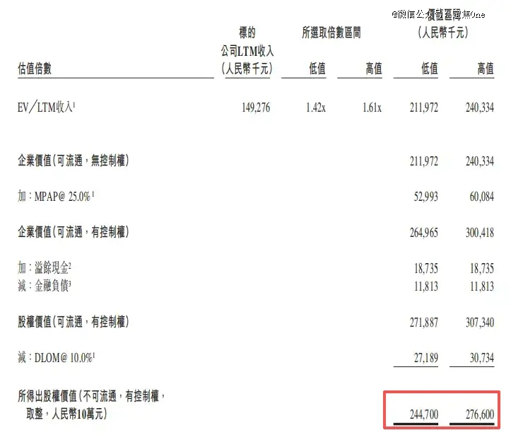 考虑到福鹿家在2024年首次实现经营利润,估值师选用了企业价值(EV)╱LTM(Last Twelve Months,过去12个月)收入倍数,作为主要估值倍数。