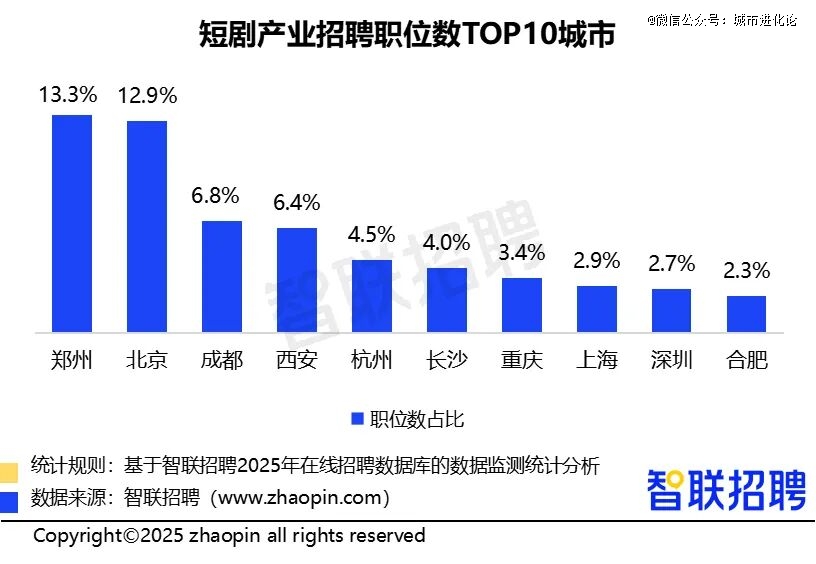 DataEye剧查查近期发布《2025中国微短剧产业综合实力城市报告》,郑州排名全国第二,仅次于北京;根据智联招聘发布的今年前三季度短剧行业人才需求,郑州更以13.3%的职位数占比位居城市榜首,三季度需求更大涨75.6%。