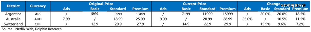 三季度奈飞主要在阿根廷、澳大利亚、瑞士等地区进行了涨价,阿根廷地区今年已经涨价过一次,但通胀太厉害,本币快速贬值,因此不得不连续涨价,澳大利亚和瑞士则属于欧美地区惯例的1-2年一次涨价周期。