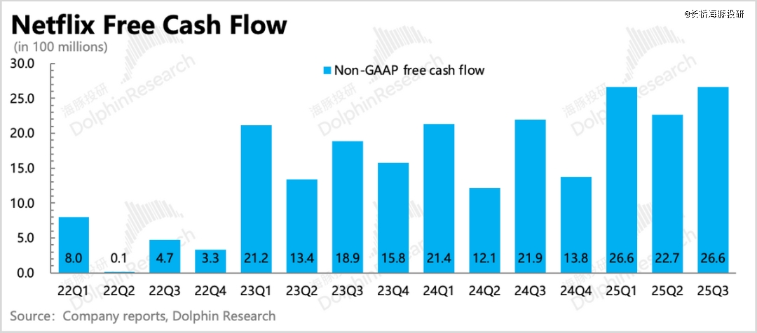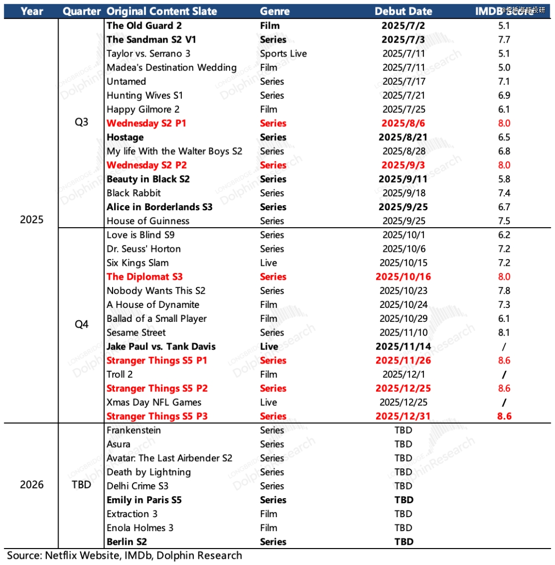 对于2025年四季度,海豚君不悲观。按照收入指引,海豚君预计用户净增还会达到1000万人。主要是基于*IP《Stranger Things》最终季的播出,以及《The Diplomat》第三季、艾美奖提名作品《Nobody Wants This》以及重磅拳击比赛(Jake Paul vs. Tank Davis)等内容。