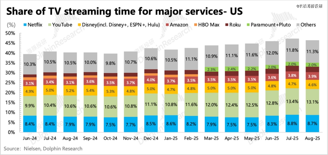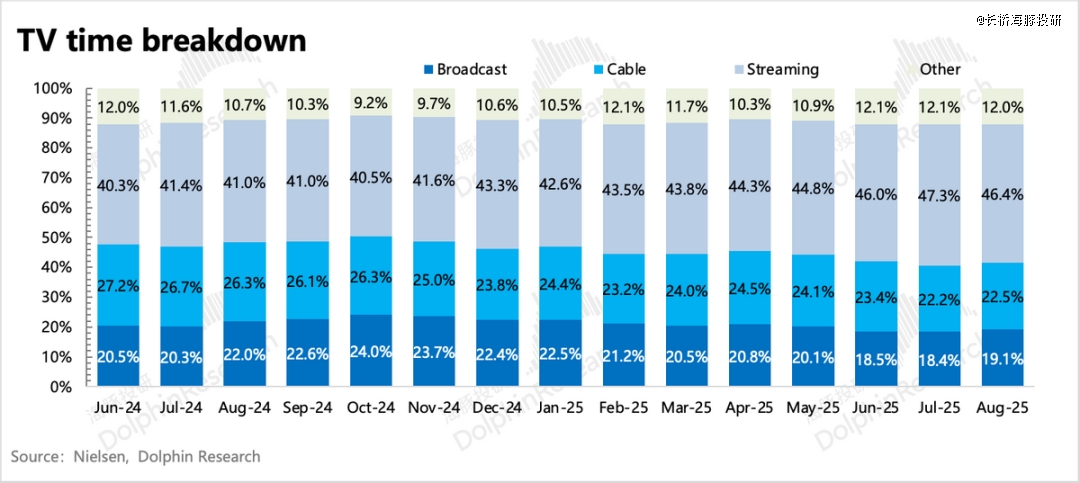 从Neilsen收视份额的数据来看,随着内容巨头主动转型流媒体,剪线趋势继续加速。流媒体中,奈飞的份额在三季度继续保持稳定同步提升,但整体趋势仍然落后于YouTube。