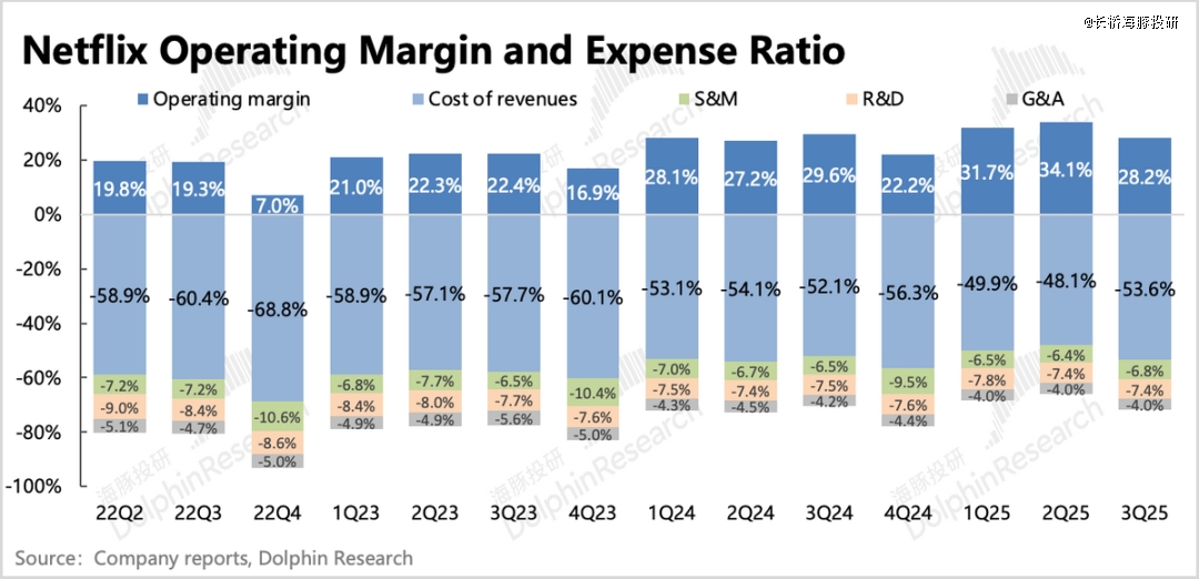 奈飞三季度实现经营利润32.5亿,其中包含一笔6.19亿美元的额外成本确认,主要涉及巴西对流媒体公司征收的市级服务税。这笔涵盖了2022年至今的累积费用被一次性计入到其他成本项,影响当期毛利率超过5个点。
