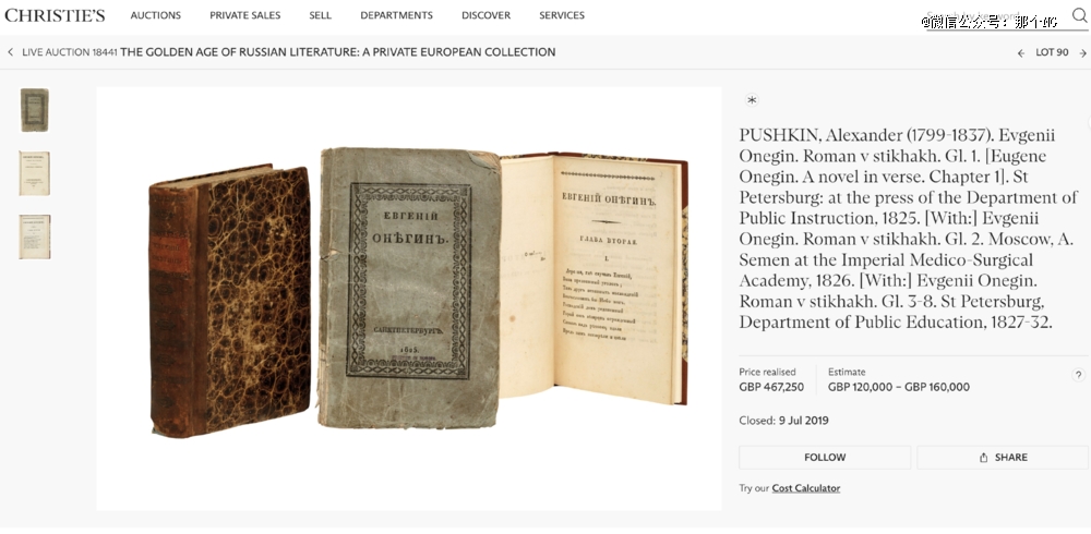 普希金的初版《叶甫盖尼·奥涅金》在2019年佳士得拍卖会上以46.7万英镑(约合414万元人民币)的价格成交