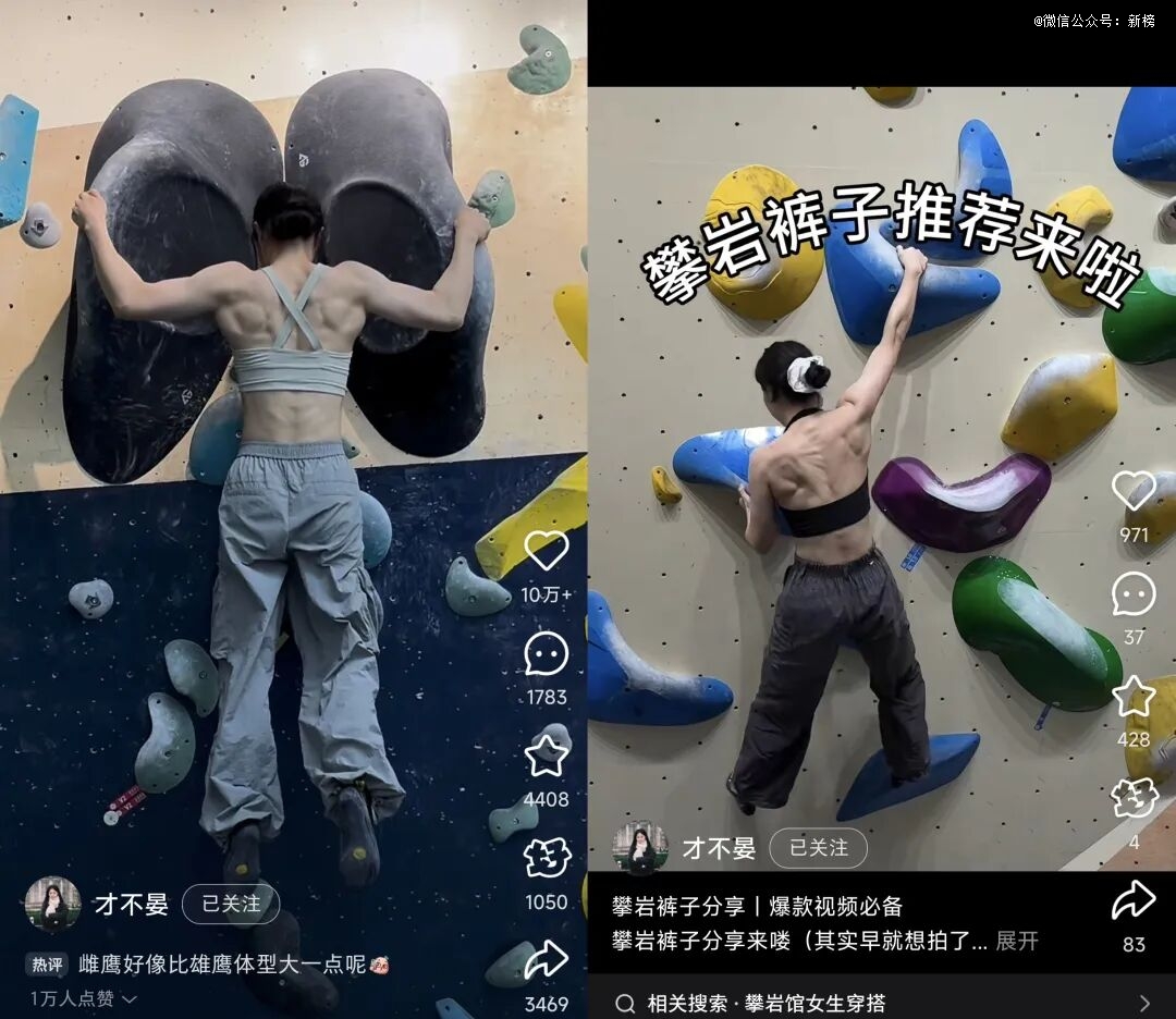 观察社交媒体也可以发现,女攀岩博主格外活跃。在小红书、抖音搜索关键词“攀岩”,并按照点赞数排序,女攀岩博主的出现频率极高。