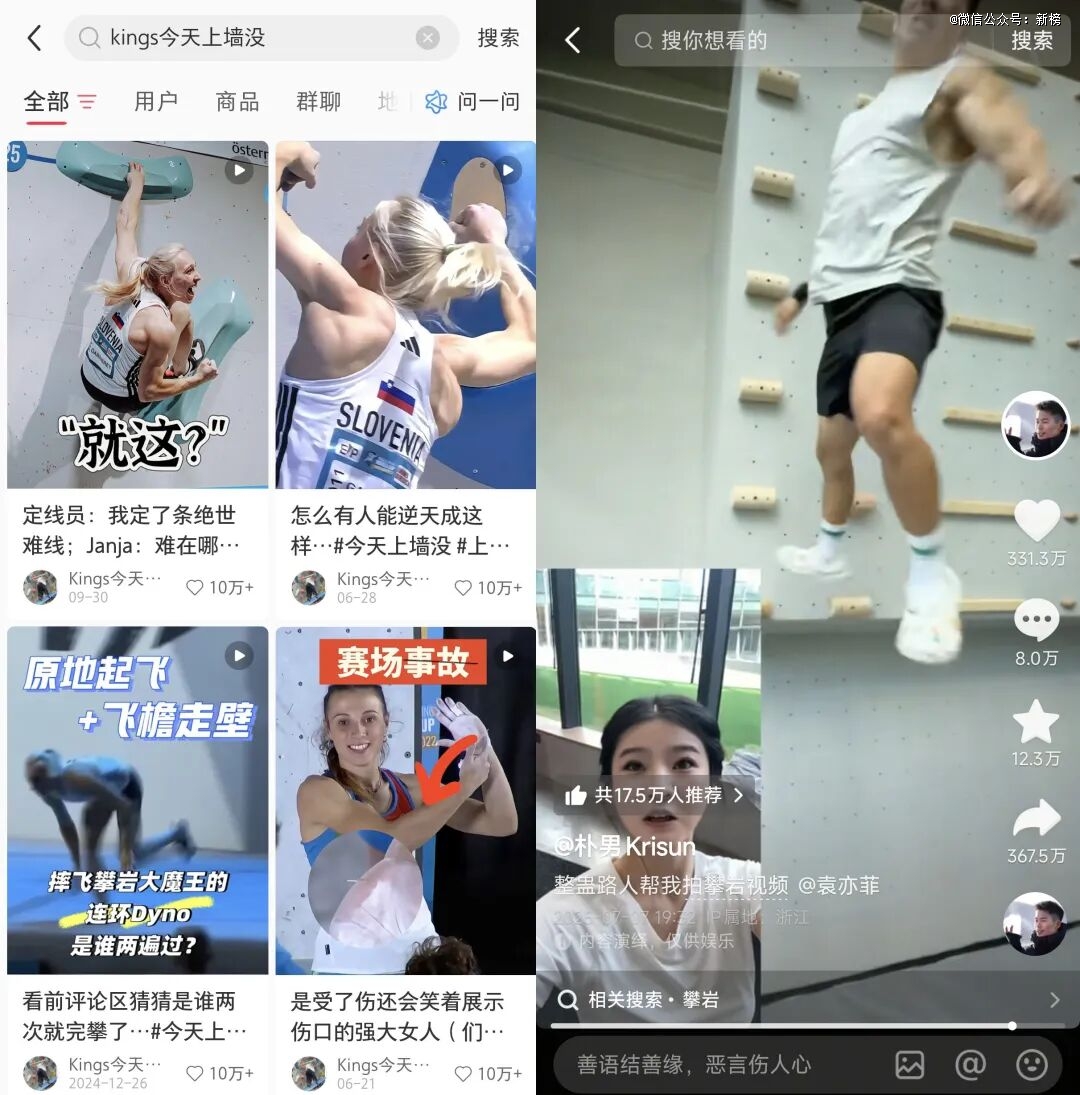 现如今,类似“曹三儿”和“安揪”这样的博主还有很多。新榜旗下数据工具新红、新抖显示,截至发稿前,小红书、抖音参与攀岩相关话题的人数分别超197万、155万。