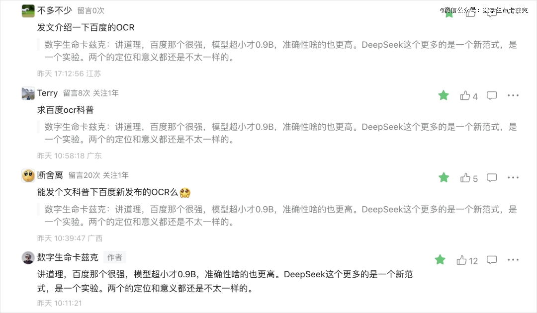 然后在我上一篇讲DeepSeek-OCR文章的评论区里,有很多朋友都在把DeepSeek-OCR跟PaddleOCR-VL做对比,也有很多人都在问,能不能再解读一下百度那个OCR模型(也就是PaddleOCR-VL)。