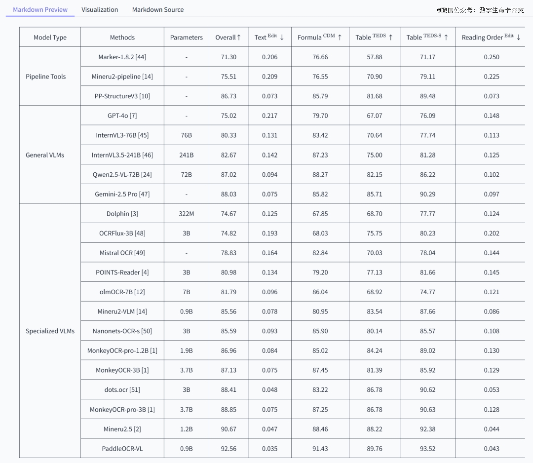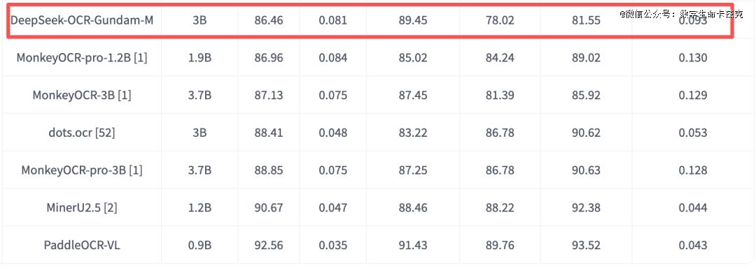 PaddleOCR-VL参数最小,效果最 好,然后因为发的刚好早了三四天,所以表里没有DeepSeek-OCR的跑分,但是OmniDocBench v1.5的最新跑分昨天也出炉了,DeepSeek-OCR综合跑分是86.46,比PaddleOCR-VL的92.56还是低了大概6分,不过也能理解。