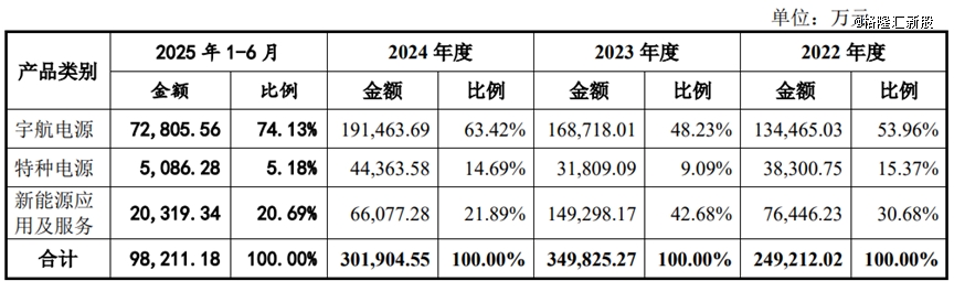 具体来看,2022年至2025年上半年(简称“报告期”),电科蓝天来自宇航电源的营收占比从53.96%提升至74.13%,占比较大;而来自特种电源、新能源应用及服务的营收占比均有所下降。