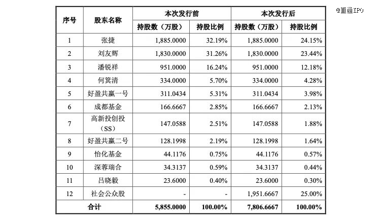 IPO后,张捷直接持有好盈科技24.15%股份,刘友辉持股23.44%。此外,成都基金持股2.13%,高新投创投(SS)持股1.88%。